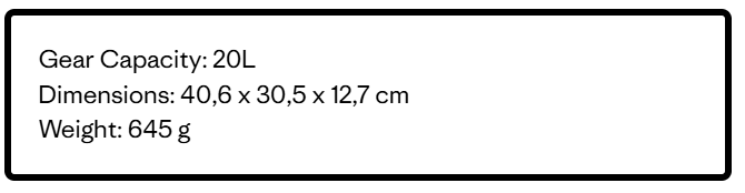 All fabrics, spacer mesh and static mesh are 100% recycled (stretch mesh is 72% recycled),and the body fabric has a durable water repellent (DWR) finish made without perfluorinated chemicals (PFCs/PFAS); pack volume is 20 liters