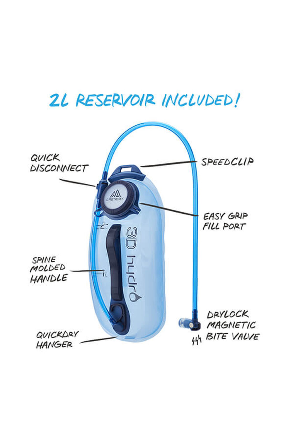 - Includes 3D Hydro quick-drying, soft molded reservoir (2 Liter) with integrated drying hanger and spine molded handle for easy refills