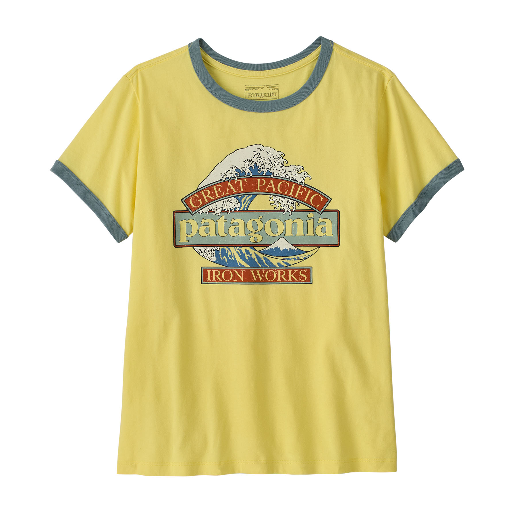 The Great Waves logo combines Patagonia’s wordmark with Hokusai’s iconic wave and Great Pacific Iron Works, the name of Patagonia’s first retail store, a short walk from some of the best waves in Ventura, California. It is screen-printed on the Women's Great Waves Ringer Tee, a retro-inspired crewneck ringer tee made from 100% organic cotton with rib-knit binding at the neck and sleeves. Made in a Fair Trade Certified™ factory.