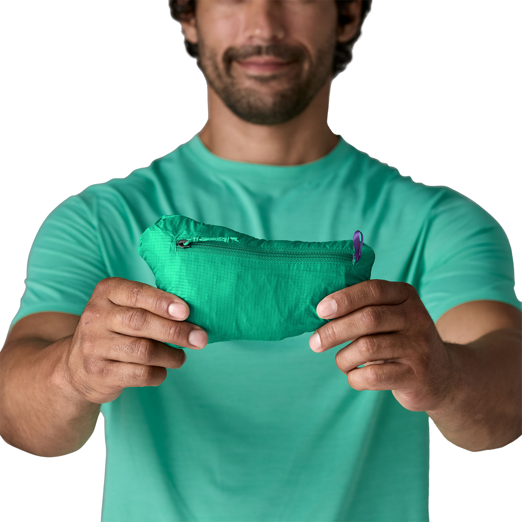 Zippered chest pocket converts to stuffsack with a reinforced carabiner clip-in loop