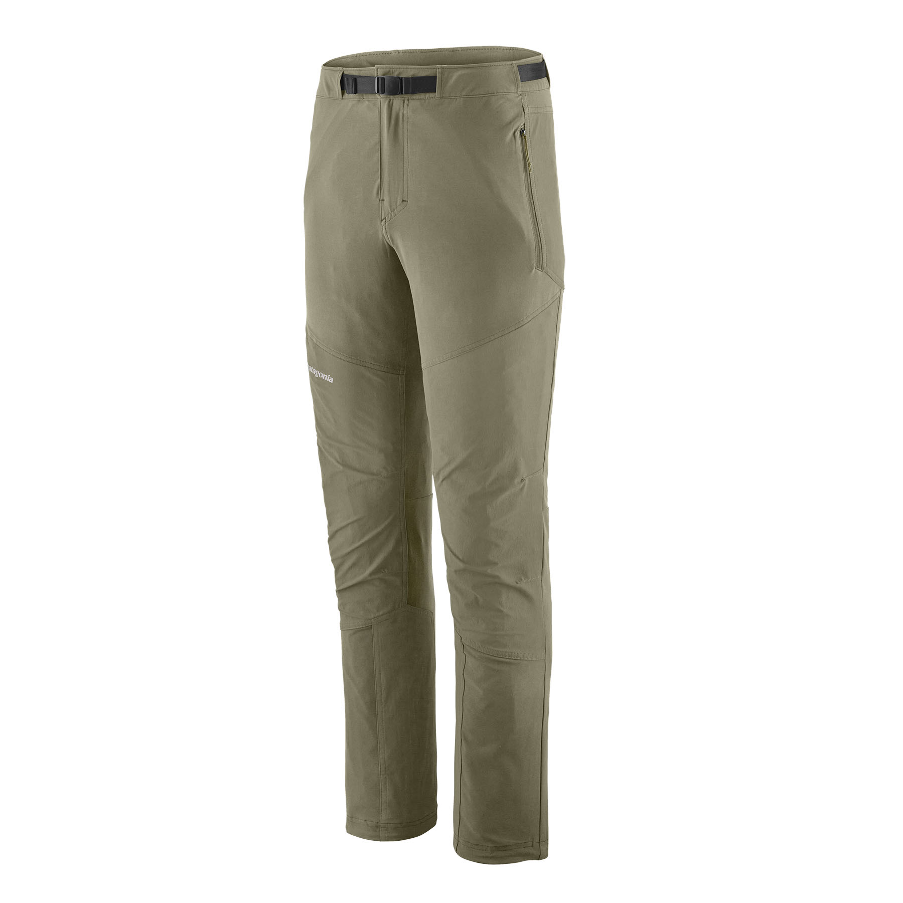 Low-profile waistband with separating zip fly and integrated adjustable belt ensures precise fit and stays comfortable under a harness or a backpack waistbelt