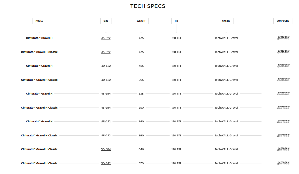 The Cinturato™ H is a gravel tire designed for tours where the surface is predominantly firm and the focus is on speed and low rolling resistance. With a low profile and compact tread spacing, it is perfect for fast and safe riding on hardpack surfaces - in all weather conditions. The special SpeedGRIP compound provides durability and optimal grip without compromising rolling performance. The Cinturato™ Gravel Hardpack is a high performance tire with unique grip properties and a high level of puncture protection.