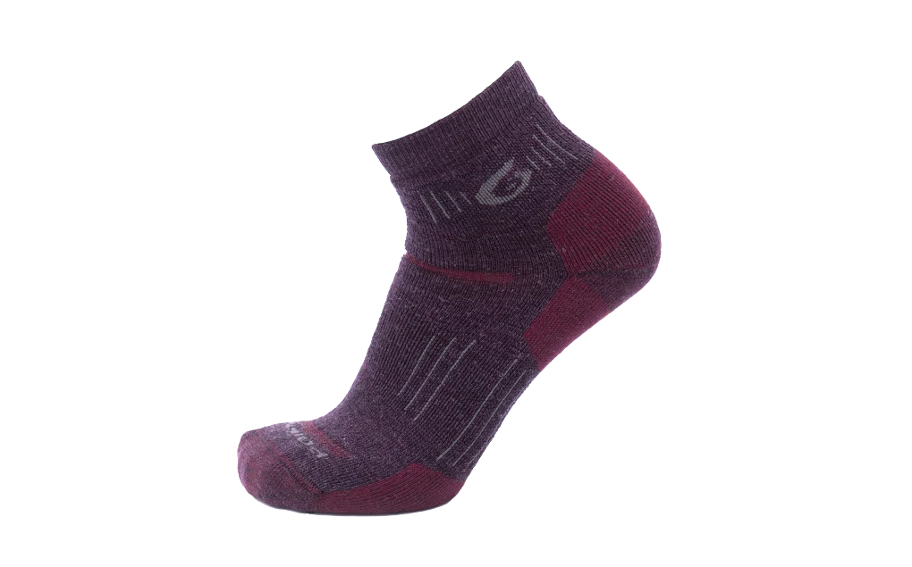 This medium cushioned quarter crew sock (2 1/2 inch cuff) helps combat lace pressure on the top of the foot by adding cushioning across the instep as well as under foot. The hiking tech medium mini merino wool sock works best with low-cut hiking shoes.