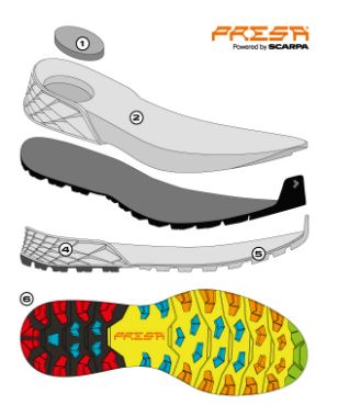 UPPER: The upper is built with Sock-Fit LW by SCARPA construction, featuring a lightweight and super breathable mesh bootie with heat-sealed reinforcements, which guarantees a precise and even wrap around the foot, while still providing outstanding comfort and flex at the ankle collar, tongue and forefoot. The shoe is built to wrap the foot with precision thanks to it’s reduced volume fit, perfect for this more technically oriented shoe. The heel is stabilized by an TPU band that completely wraps the shoe.